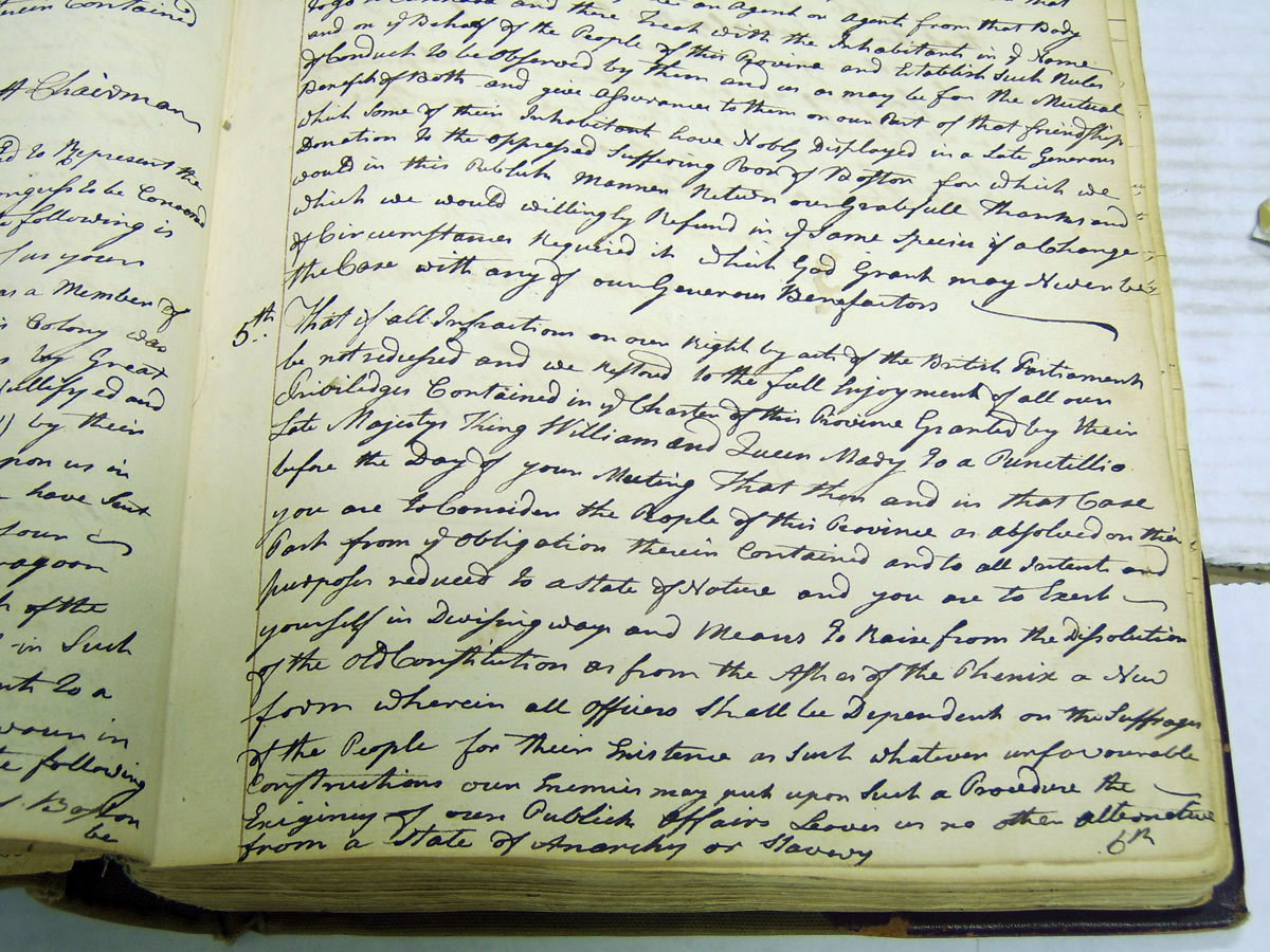 Reproduced here are portions of the instructions from the October 4, 1774 Town Meeting, from Worcester’s Town Records, volume 4, kept in a vault in the basement of Worcester City Hall, with permission from the Worcester City Clerk. The declaration in favor of forming a new government appears in the fifth instruction on the second page. The first sentence to the fifth instruction states a contingency: Bigelow is to proceed with his instructions only if the William and Mary Charter is not fully restored before the first day the Provincial Congress is to meet. Dates here are key: the instructions were given on October 4, and the Congress was to meet October 5, the very next day. Clearly the charter would not be restored by then, and Bigelow would then be bound by this instruction.